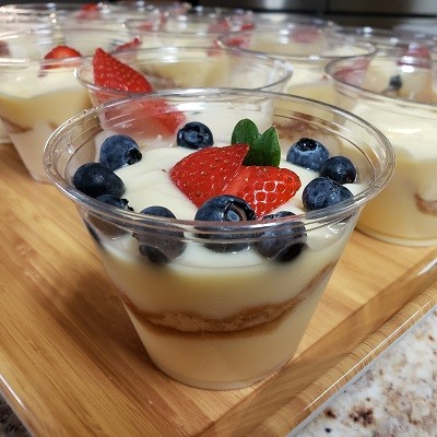 - Garnish each pudding shot with a small dollop of whipped topping and strawberries.
