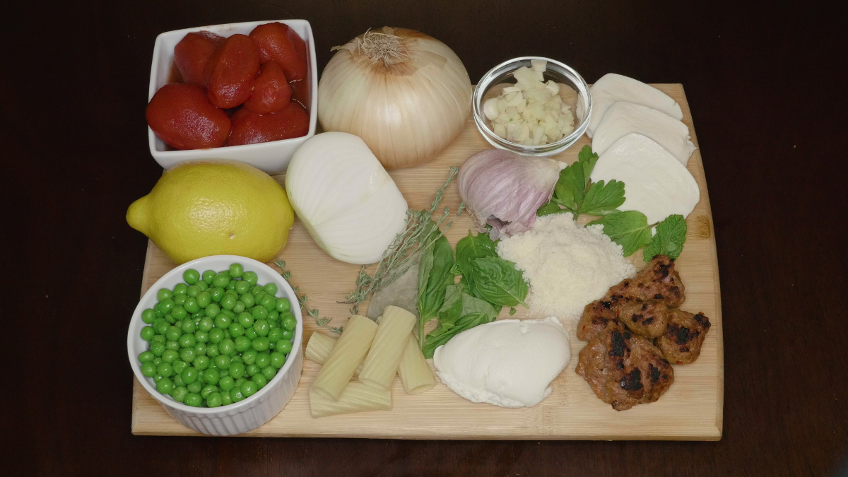 - Combine ricotta with salt, pepper, thyme, parsley, mint, lemon zest, half the mozzarella and half of the Parm.