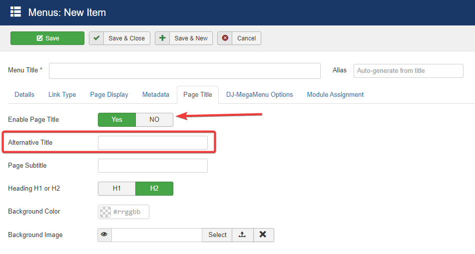 - On the Page Title tab of your Menu Item, set Enable Page Title to Yes.