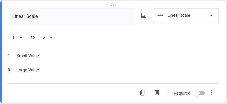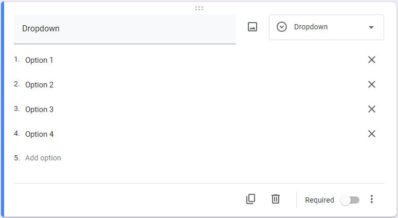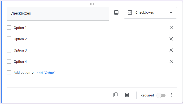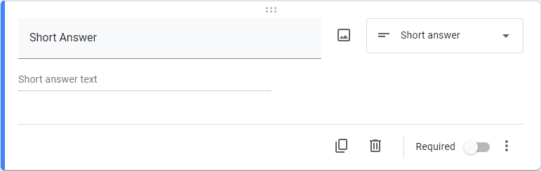 Returning to the add questions button, you can choose from various question types depending on your needs and the intention of your form. You can also establish if the form will be accepted without each question being filled out. These question types are followed by examples of how they look in Google Forms: