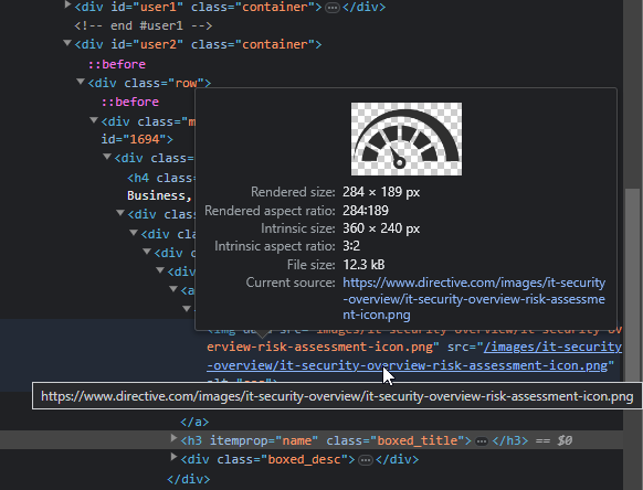 This will pop up the Inspector window, which will have a lot of information. You are looking for a snippet of code that starts with <img. If you hover over that, or more specifically, hover over the part of the code that has your image path, the inspector tool will give you a small popup that displays the image dimensions.